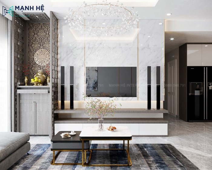 Bàn thờ đứng được đặt cạnh kệ tivi mang lại sự uy nghiêm, sang trọng cho không gian phòng khách